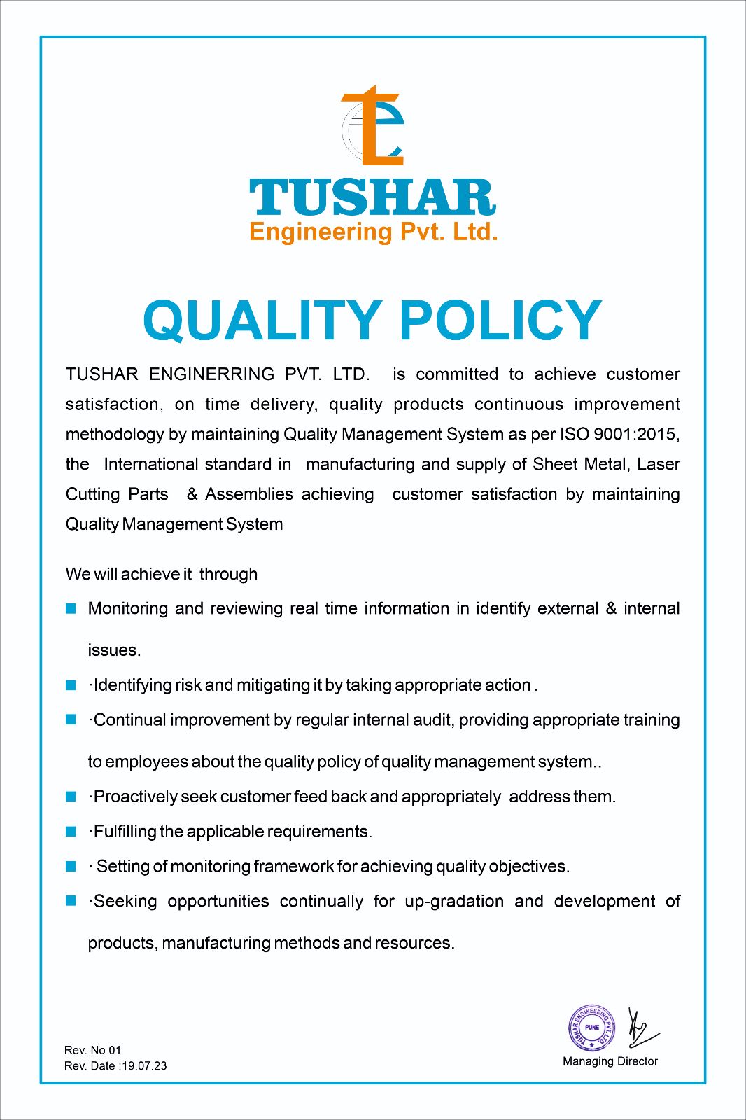 At Tushar Engineering Pvt. Ltd., we are committed to excellence through on-time delivery, superior products, and continual improvement. Guided by ISO 9001:2015,